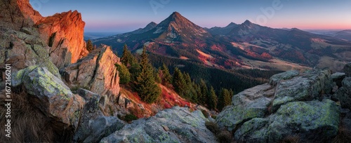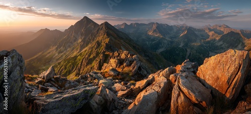 Panoramic view of the Tatra Mountains at sunset, showcasing rugged peaks, craggy cliffs, and dramatic rocky terrain.