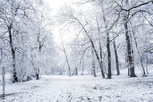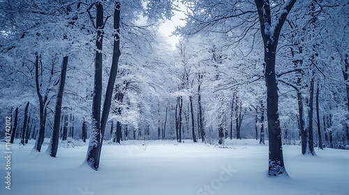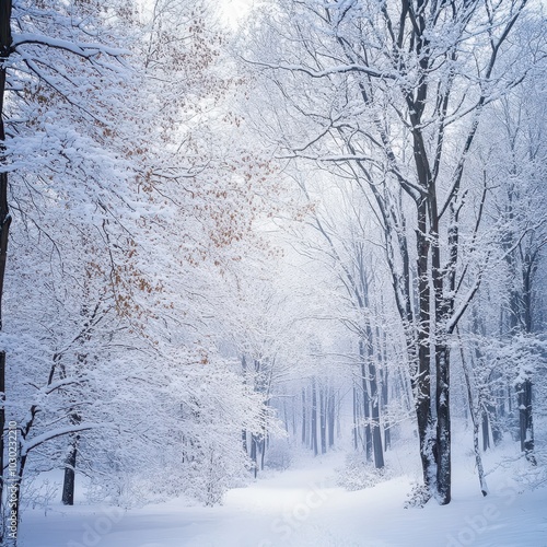Serene winter landscape with snow-covered trees lining a peaceful pathway.