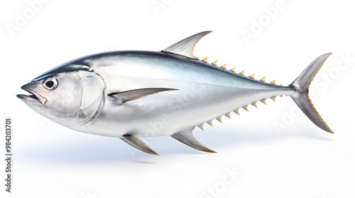 Fresh whole tuna fish with glossy silver skin isolated on white background